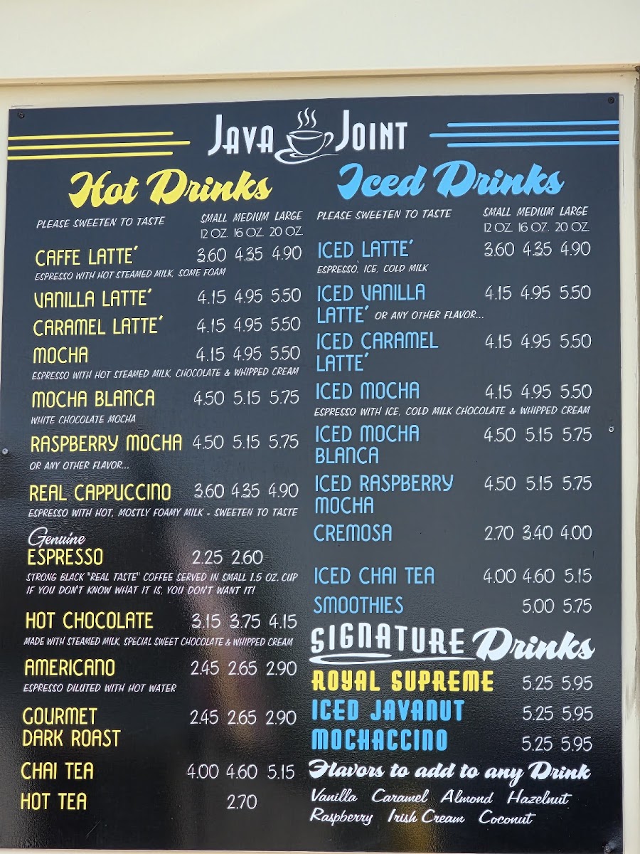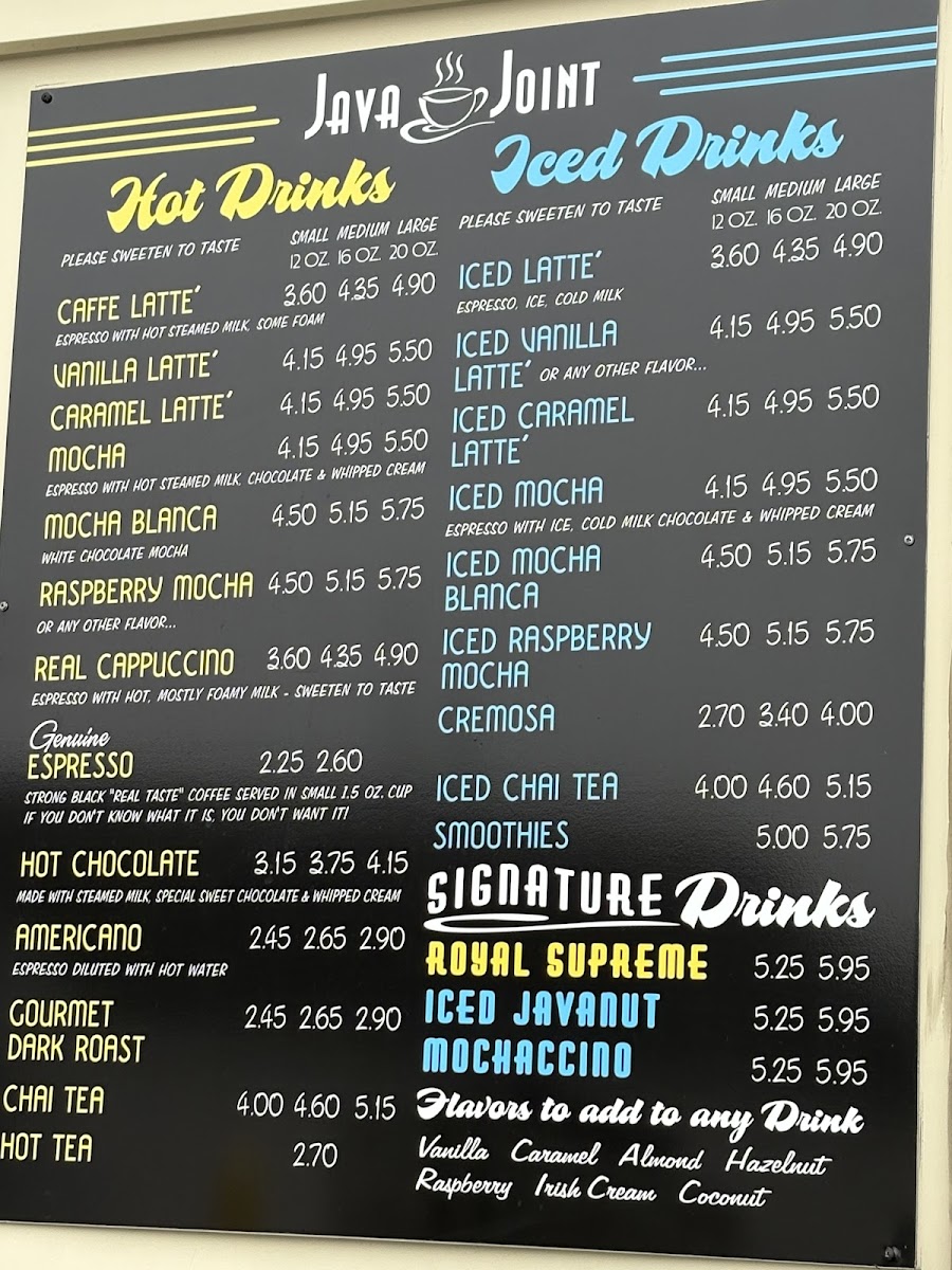 Introducing Java Joint Drive Thru Coffee, a delightful oasis for coffee lovers located at 7370 Hamilton Blvd, Trexlertown, PA. This charming drive-thru only spot offers a carefully curated menu designed to satisfy every taste bud. Whether you're in the mood for a Caffe Latte or an indulgent Caramel Mocha, their hot drinks are a warm embrace on chilly mornings.